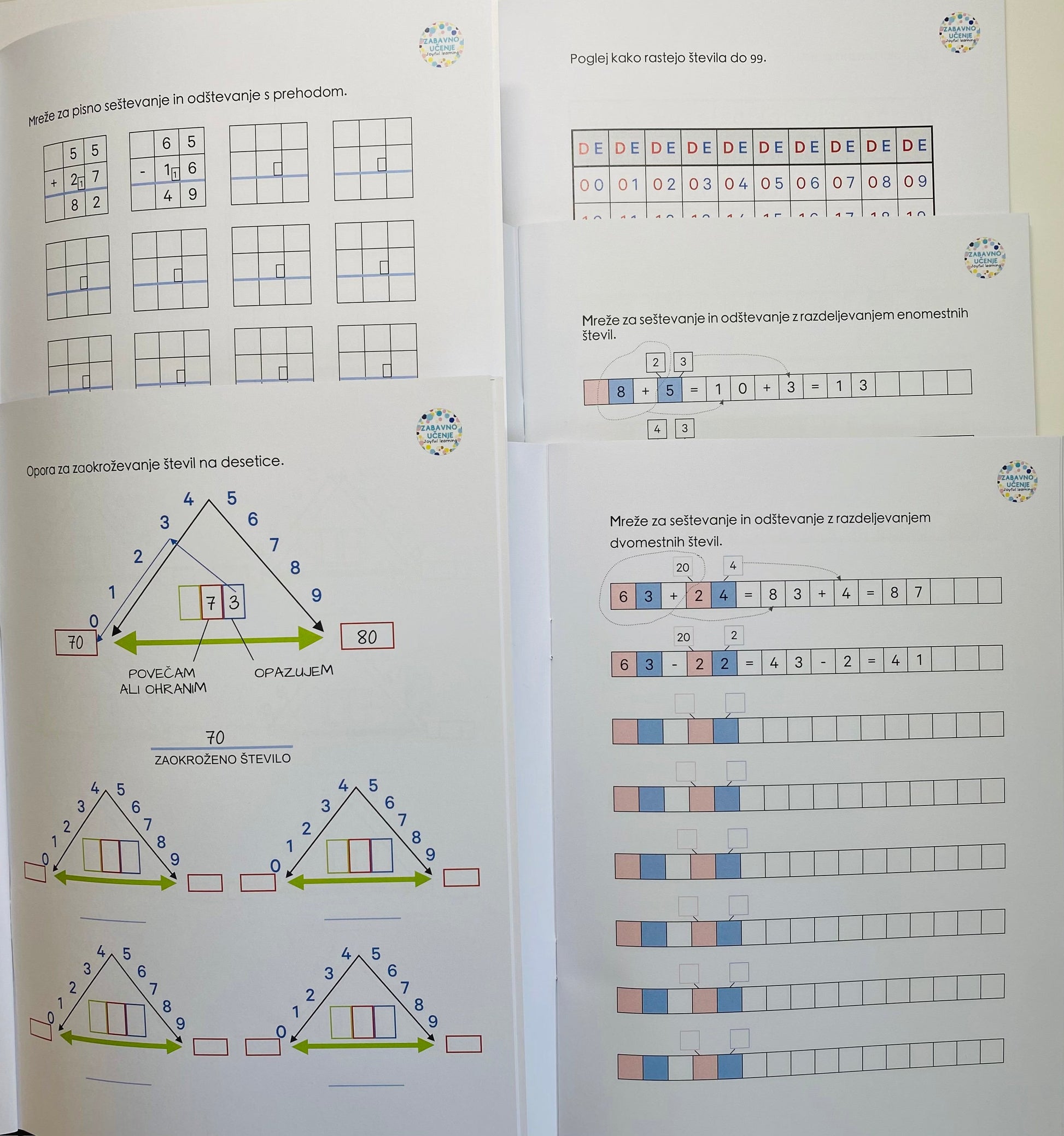 - vsebuje mreže za učenje seštevanja in odštevanja s podpisovanjem, ob prehodu čez desetico in brez;