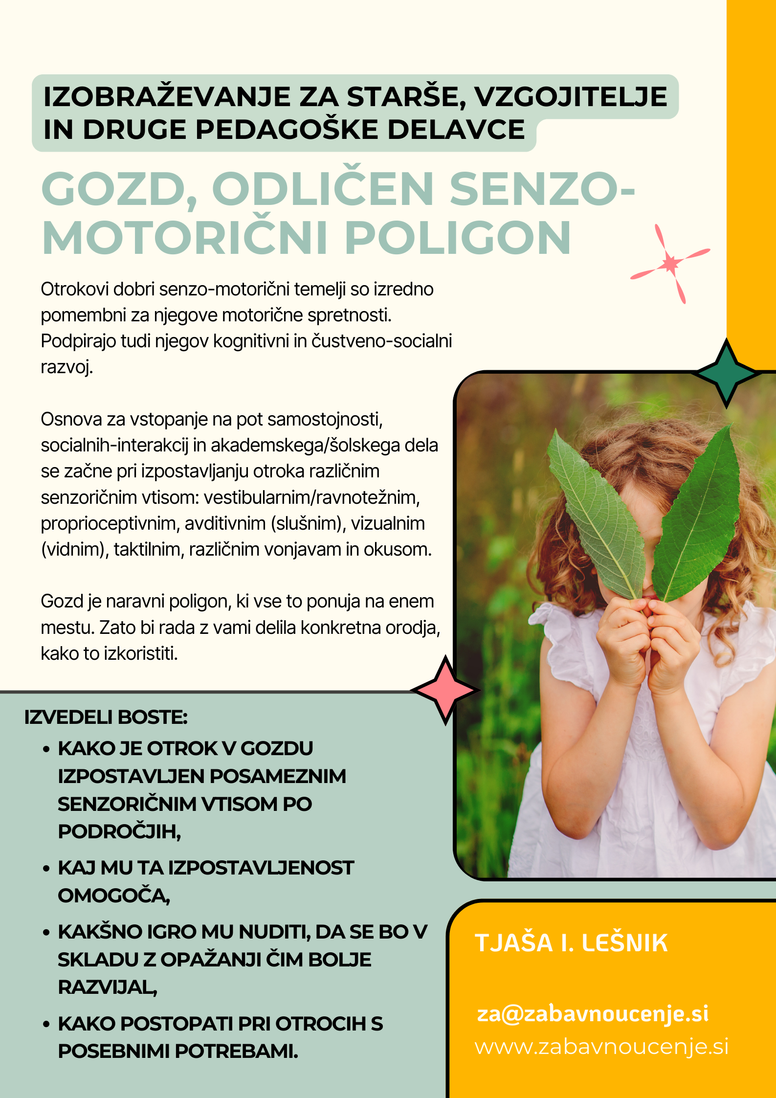 Ne glede na to na katerem področju si želimo otrokovega uspeha (motoričnem, socialnem, emocionalnem ...), so pomembni njegovi dobri senzo- motorični temelji. Ti omogočajo, da vse čutne vtise, ki se dogajajo znotraj in zunaj njega ustrezno zazna, obdela in se nanje odziva. Poleg motoričnega področja podpirajo kognitivni in čustveno-socialni razvoj. Gozd je naravni poligon, ki vse to ponuja na enem mestu. Podelila vam bom: